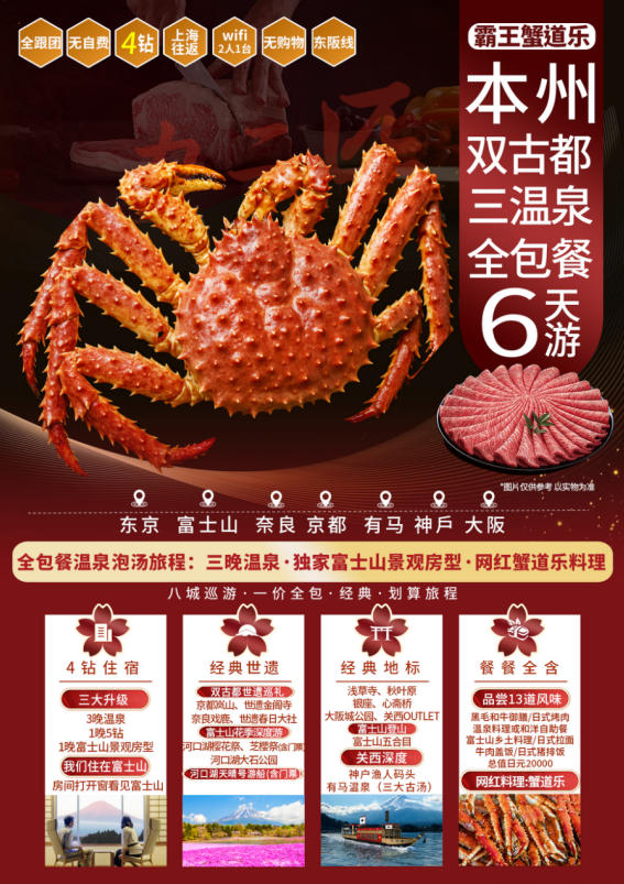 | 正常 | 2026/04/27 2026-04-27 周一 | 上海起止 | 6 | 2026春季【日本本州】霸王蟹道乐双古都三温泉全包餐6天-名阪-纯玩 | ≥9 | 34 | 立即预定 | 5999 | 0 | 0 | 无 |